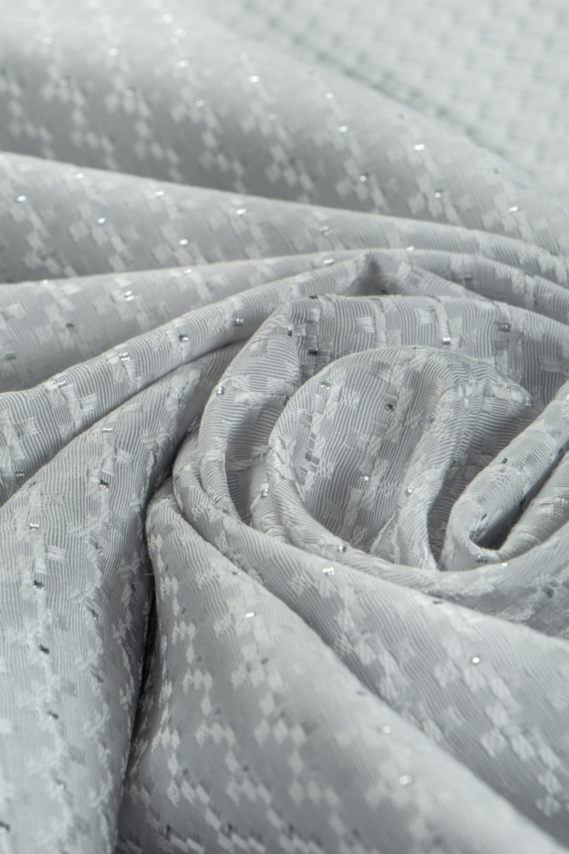 Itaalia jacquardi kostüümikangas hõbehallis. Väga huvitav, korrapärane väikese kontrolli muster loob 1 cm laiused horisontaalsed triibud. Lisaks on see kaunistatud läikivast hõbeniidist valmistatud ruutudega. Kangas on pehme ja mitteelastne ning kergelt jäik. See sobib suurepäraselt kostüümi, kleidi või muljetavaldava ülikonnaga vesti õmblemiseks.