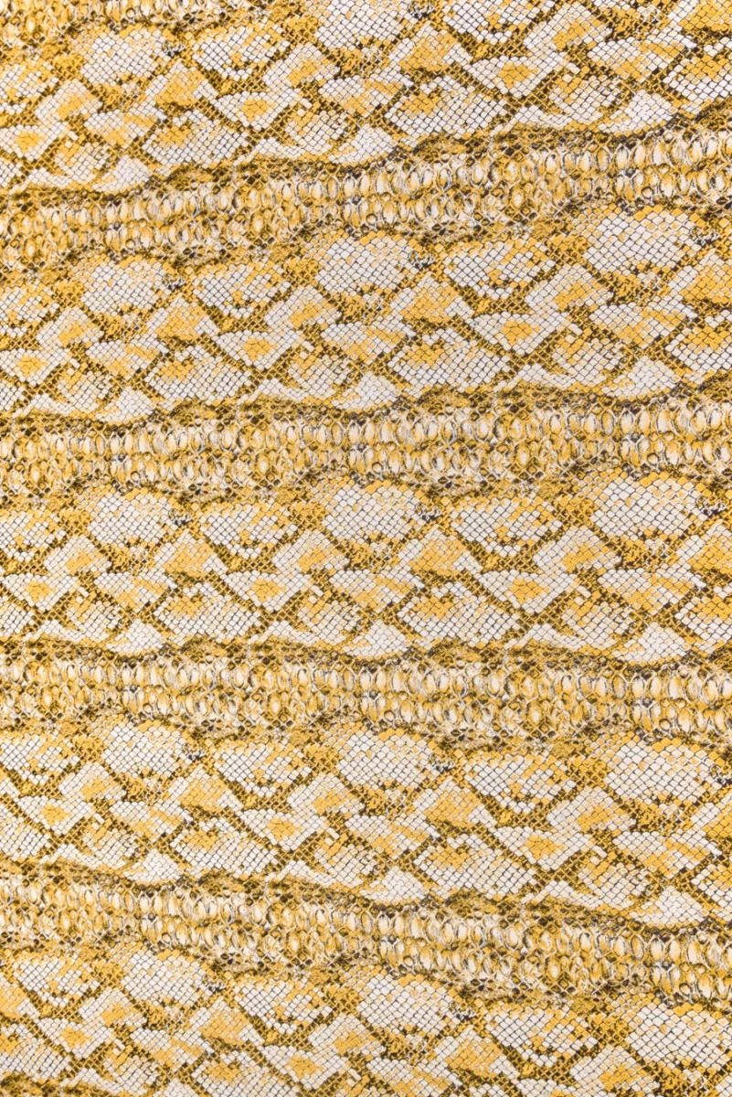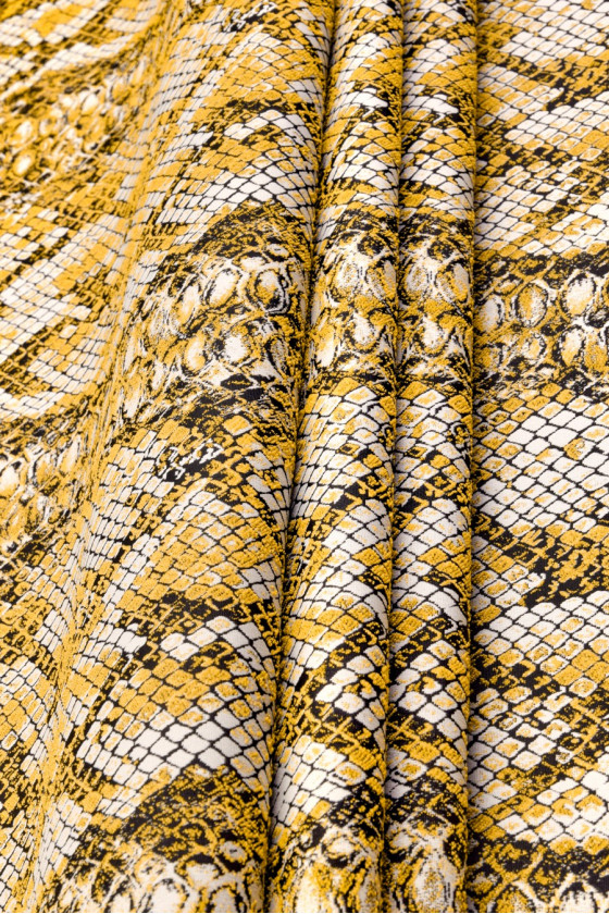 Elastne jacquard, millel on ilus madu muster hall-sinepi-mustades värvides. Kanga struktuur sobib ideaalselt kleitide, seelikute, pükste õmblemiseks