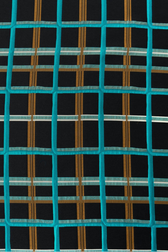 Itaalia žakaarkostüümi kangas suure ruuduga (umbes 9cm). Kanga taust on tehtud musta värvi ning ruuduline muster türkiissinise ja mee värviga. Türkiissinised triibud on kergelt läikivad, mee aga matid. Must täidis on kergelt kareda struktuuriga. Materjal on elastne ja kergelt jäik - sobib suurepäraselt kostüümi või mantli õmblemiseks ja dekoratiivkangaks.