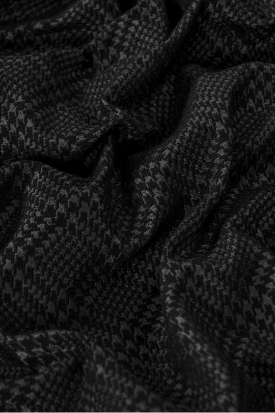 Itaalia kostüümikangas grafiidist ja must kana jalamotiiviga, mis moodustab tšeki (umbes 3cm). Muster on matt ja taust on veidi läikiv.