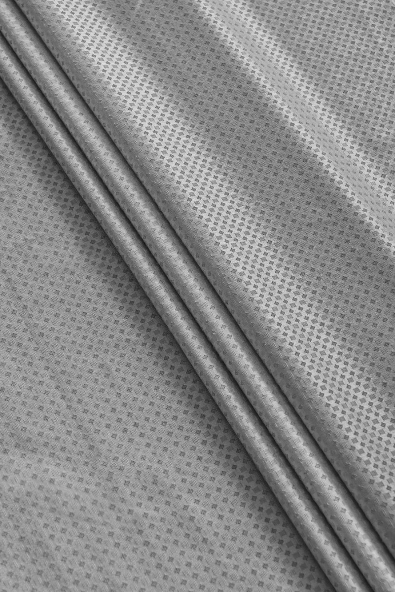 Itaalia žakaarkostüümi kangas hõbehall. Väga peene geomeetrilise mustriga materjal - teemandid ja ruudud. Kanga taust on kergelt läikiv ja muster matt. Kangas on õhem, jäik, kerge läikega - sobib suurepäraselt kleidi, seeliku, kostüümi, pükste õmblemiseks.