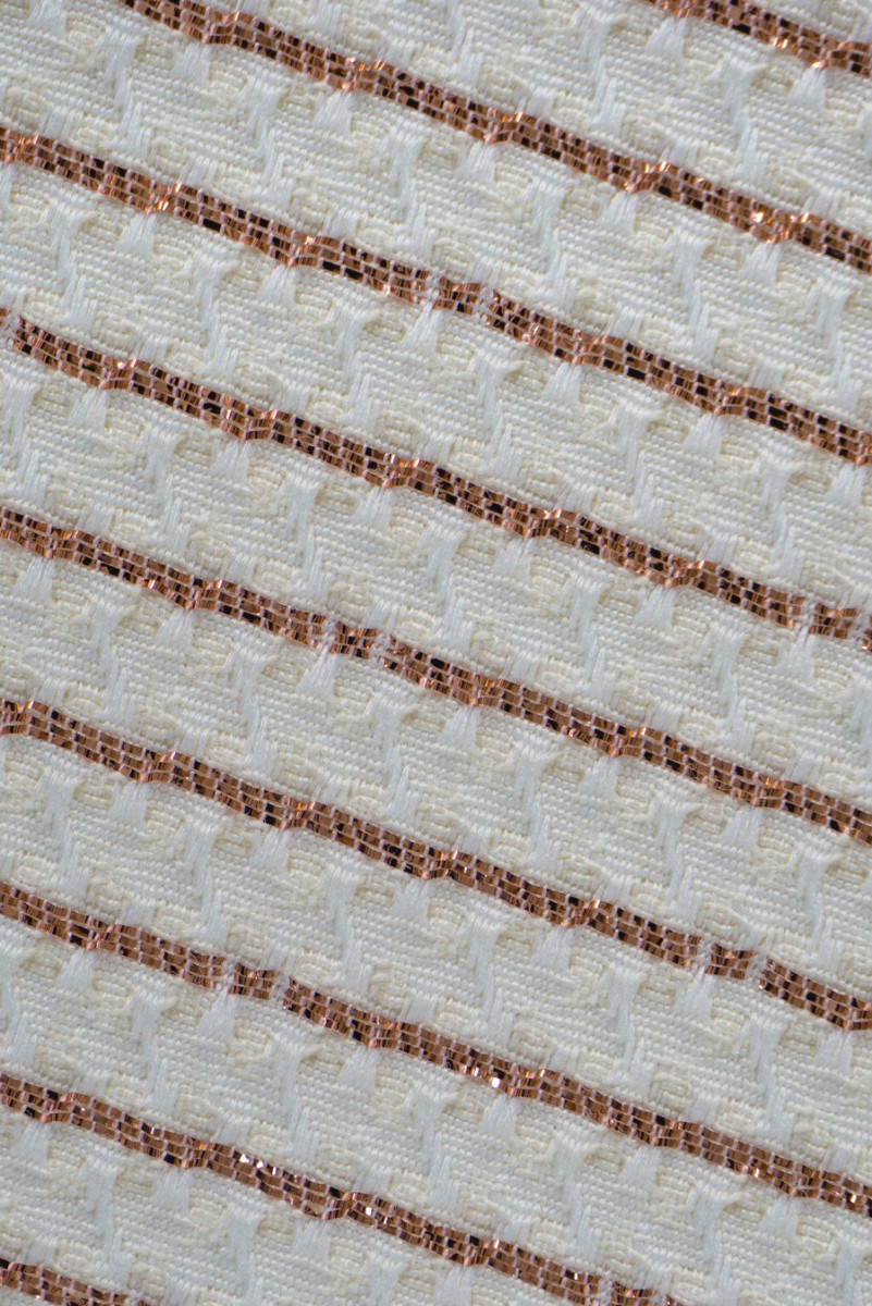 Itaalia žakaarkostüümikangas écru värvi läikivast vaskniidist õmblustega. Need moodustavad umbes 0,7 cm laiused horisontaalsed triibud. Kangas on kergelt jäik, mitteelastne, elegantne - sobib suurepäraselt kleidi, seeliku, kostüümi või mantli õmblemiseks.