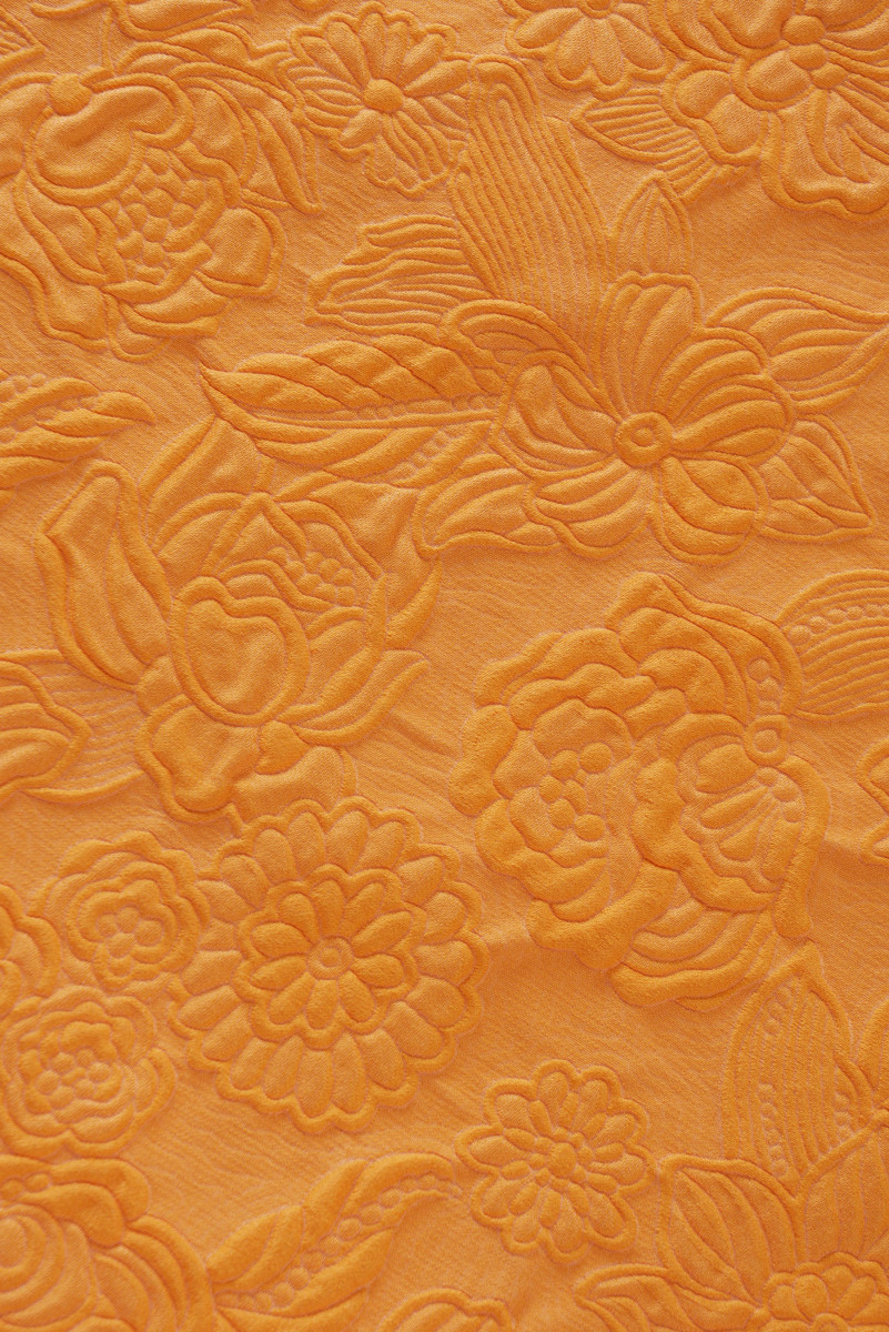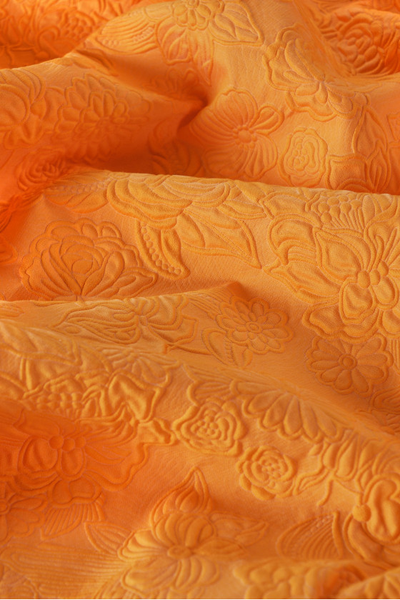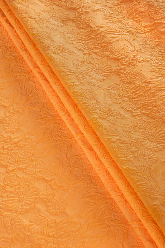 Itaalia žakaarkostüümi kangas, millel on tihe pigistatud lillede motiiv. Tervikut hoitakse ilusas oranžis värvitoonis. Kangas on elastne, jäik, väga suurejooneline. See sobib suurepäraselt kevadmantli, glamuurse ülikonna või kleidi õmblemiseks.