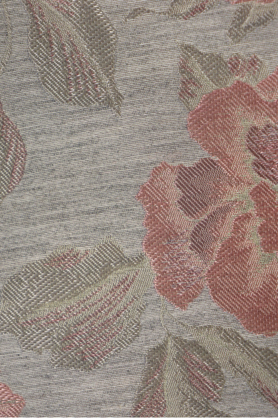 Itaalia jacquardi kostüümikangas hallis melange'is roosade lillede motiiviga. Kangas on kupongiga mõõtmetega 110 cm* 153 cm. Kupongi ülemine osa on sile, allosas on ilus 40 cm laiune lillemotiiv.