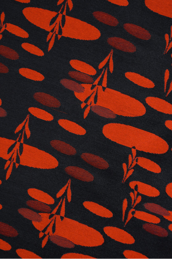 Itaalia jacquardi kostüümikangas tume mereväe sinine oranžide punktide ja okste motiiviga - seda saab õmmelda mõlemalt poolt. Kangas on paksem, jäigem, mitteelastne ja iseloomuliku läikega. Ideaalne kleidi, kostüümi, seeliku õmblemiseks või dekoratiivsetel eesmärkidel.