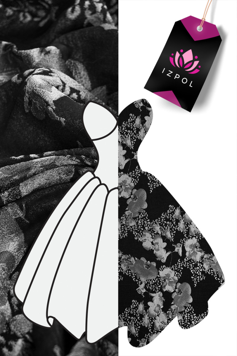 Itaalia jacquardi kangas mustas hallide lillede motiiviga - loodusliku siidi ja polüestri segu. Õhuke, kergelt läbipaistev, pehme, mitteelastne kangas, millel on siidkangale iseloomulik õrn sära - seda saab õmmelda mõlemalt poolt.