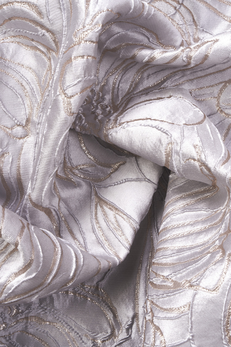Itaalia žakaarkostüümikangas hall ja plaatina, millel on suurte, kergelt kumerate lillede motiiv. Keskmise paksusega, mitteelastne, jäik kangas - ideaalne kostüümi, kleidi, seeliku, jope, mantli õmblemiseks või dekoratiivsetel eesmärkidel.