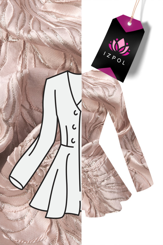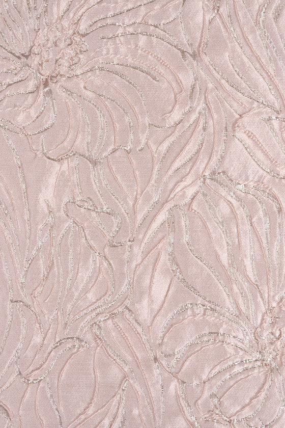 Itaalia žakaarkostüümikangas pulberplaatinast, millel on suurte, kergelt kumerate lillede motiiv. Keskmise paksusega, mitteelastne, jäik kangas - ideaalne kostüümi, kleidi, seeliku, jope, mantli õmblemiseks või dekoratiivsetel eesmärkidel.