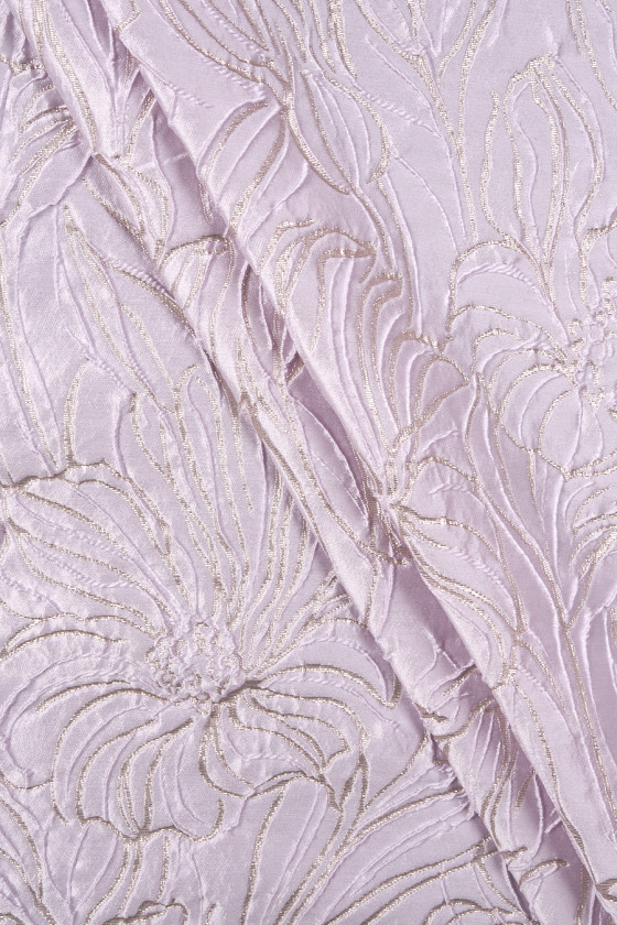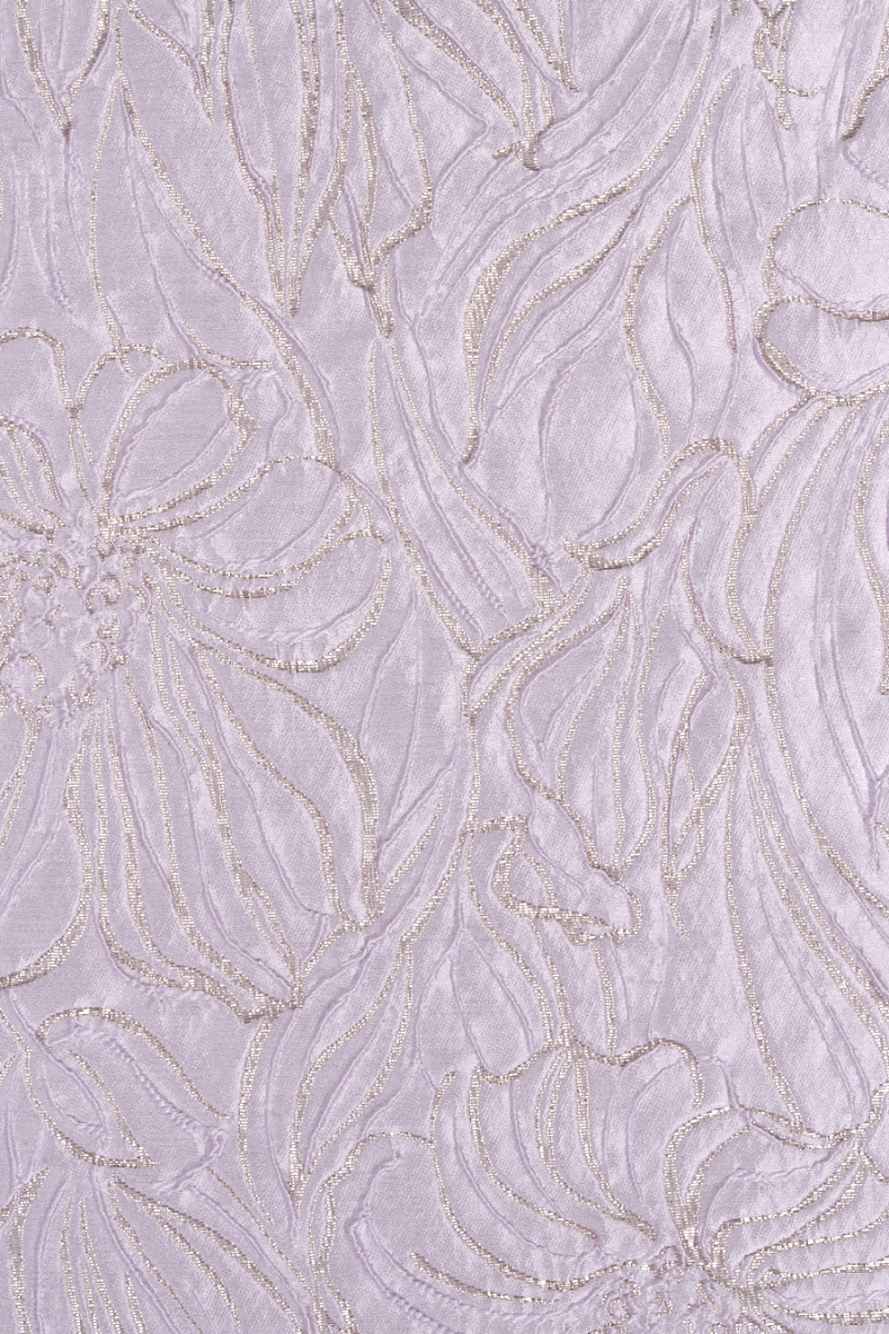Itaalia jacquardi kostüümikangas lilla ja plaatina kujul, mille motiiv on suured, kergelt kumerad lilled. Keskmise paksusega, mitteelastne, jäik kangas.