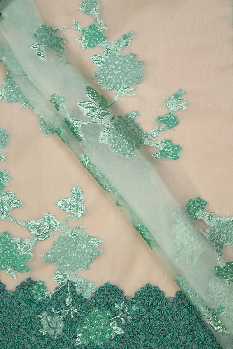 Itaalia organza kangas kupongiga mõõtmetega 200 cm* 140 cm, kaunistatud lurex niidiga. Mündikangas rohelise buz-lillede jacquardi motiiviga, muster pakseneb kupongi põhja suunas, mis on viimistletud 25 cm laiuse ribaga pudelirohelise värviga.