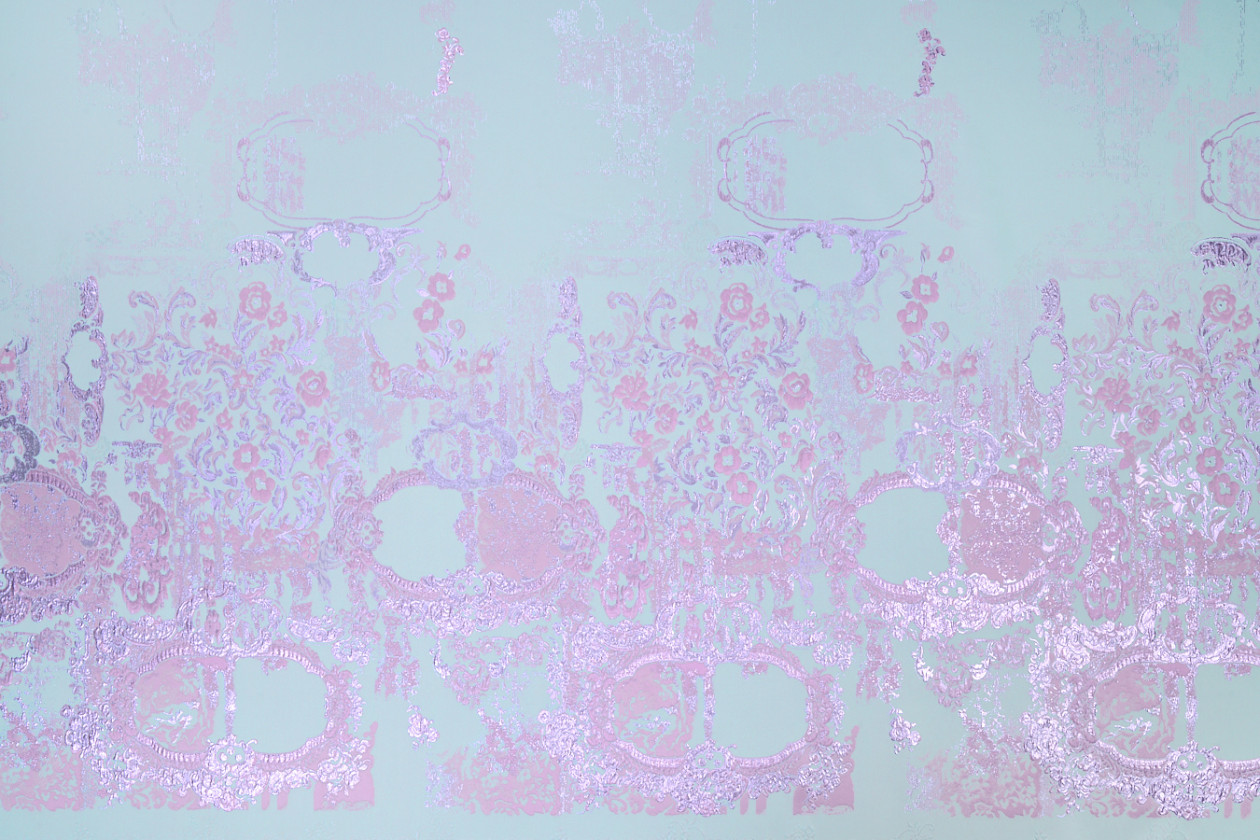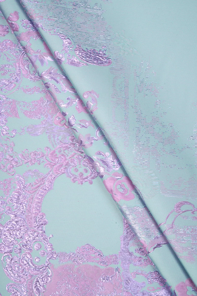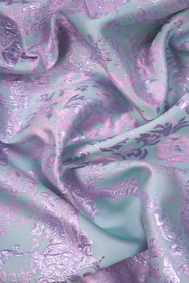 Itaalia jacquardi kostüümikangas kerge türkiisiga, millel on idamaiste paneelide roosa ja lilla motiiv - muster on ringikujuline. Keskmise paksusega, läbipaistmatu, mitteelastne, kergelt jäik kangas - ideaalne kleidi, seeliku, kostüümi või dekoratiivsetel eesmärkidel õmblemiseks.