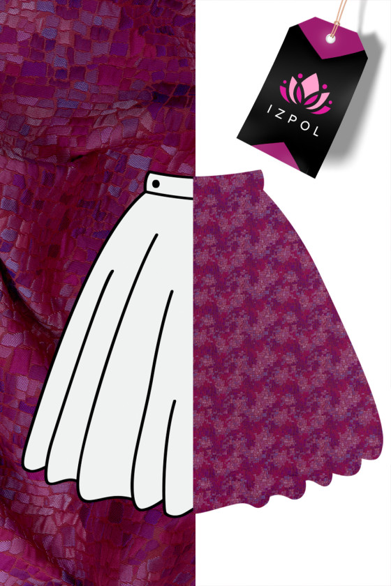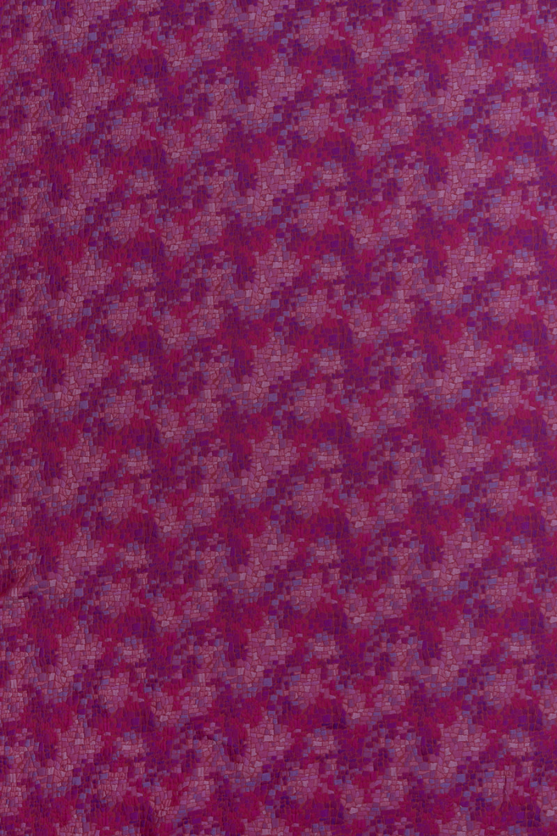 Itaalia jacquardi kostüümikangas, millel on väikesed, tihedalt paigutatud ebakorrapärase kujuga ruudud, roosa, fuksia ja lilla värvides. Punasel taustal tehtud veidi tõstetud muster. Kangas on pehme, läbipaistmatu, mitteelastne.