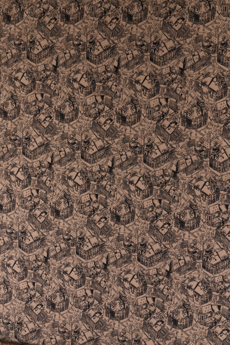 Itaalia jacquardi kostüümikangas, mis kujutab linnakaarti kaameli taustal. Mustast tehtud tihe, korduv muster kujutab erinevat tüüpi hooneid ja tänavaid nende nimedega. Kangas on pehme, elastne, läbipaistmatu ja drapeerib hästi. See sobib suurepäraselt kostüümi, kleidi, seeliku ja pükste õmblemiseks.