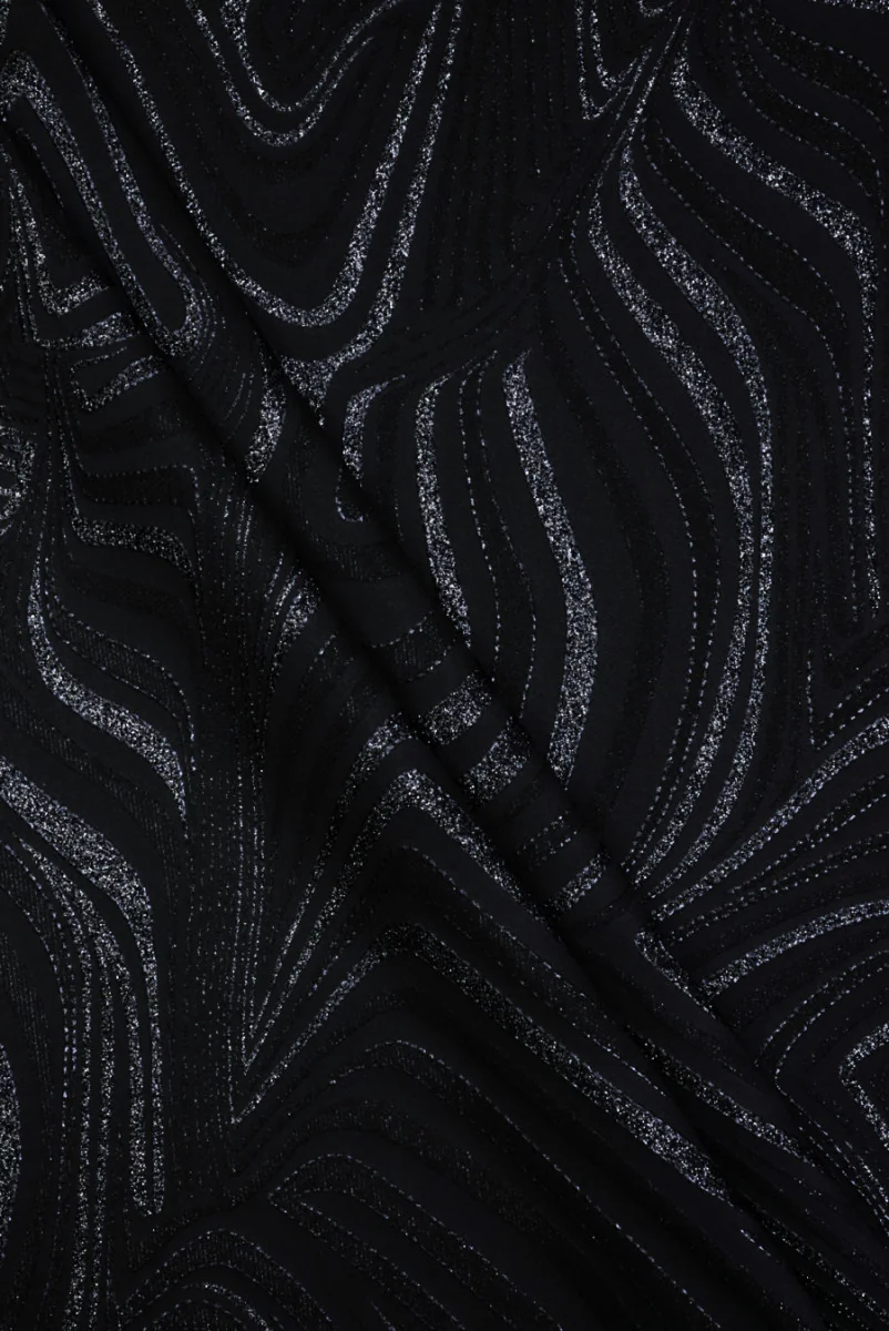 Itaalia žakaarkangas läikivate mustade lainete motiiviga mustal taustal. Kangas on õhuke, kuid täiesti läbipaistmatu, üsna pehme, mitteelastne, kerge ja väga suurejooneline. Soovitame kasutada voodrit. See sobib suurepäraselt pidulike rõivaste, näiteks kleitide ja seelikute jaoks. See sobib hästi ka jakkide, jakkide või heledate mantlitega. Saadaval on erinevad värviversioonid.