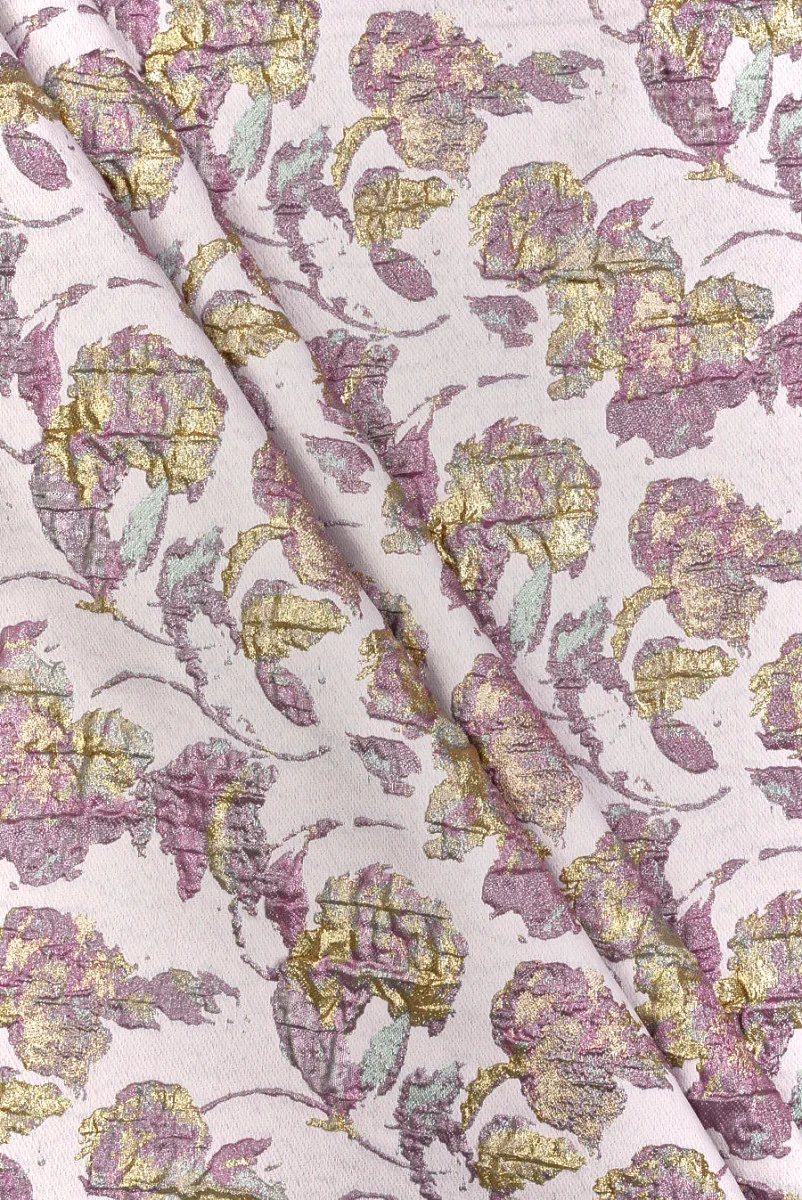 Žakaarkangas lillekujulise motiiviga pastellroosa, helerohelise ja kuldse tooniga väga heleroosa mati taustaga. Tihe ja kumer muster, kus üks element on umbes 7 cm * 8 cm suurune ja valmistatud läikivatest niitidest. Kangas on üsna õhuke, kuid läbipaistmatu, elastne, käepidemest pehme ja istub veidi jäigalt. Romantiline ettepanek, millest saate luua kleite, seelikuid, jakke, veste.