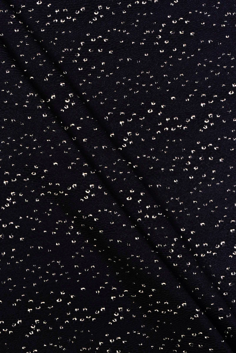 Polüester žakaarkangas, millel on mustal taustal väikeste kuldsete täppide motiiv. Muster on ebakorrapäraselt paigutatud ja tervik on tehtud peene kumera struktuuriga. Kangas on õhuke, kuid läbipaistmatu, mitte elastne, katab üsna jäigalt ja on viimistletud peene läikega. Elegantne ettepanek, millest saate luua kleite, seelikuid, jakke ja isegi õhukesi mantleid.