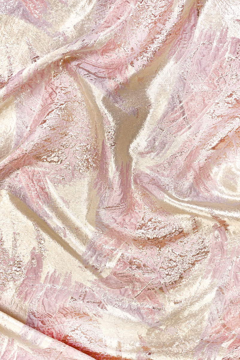 Polüester žakaarkangas heleroosade ja kuldroosade elementide motiiviga heledal pärlmbeežil taustal. Muster on üsna suur, tihe ja üksikuid elemente korratakse regulaarselt. Kangas on elastne, kerge, langeb üsna jäigalt, õhuke, kuid läbipaistmatu ja särab imeliselt. Elegantne pakkumine inimestele, kellele meeldivad tugevad mustrid värsketes värvides. See sobib suurepäraselt kleitide, seelikute, kostüümide ja jakkide jaoks.