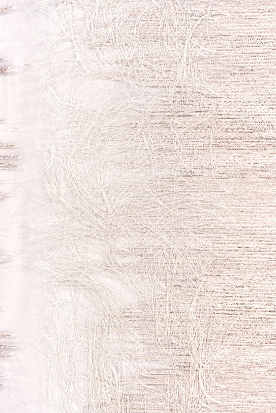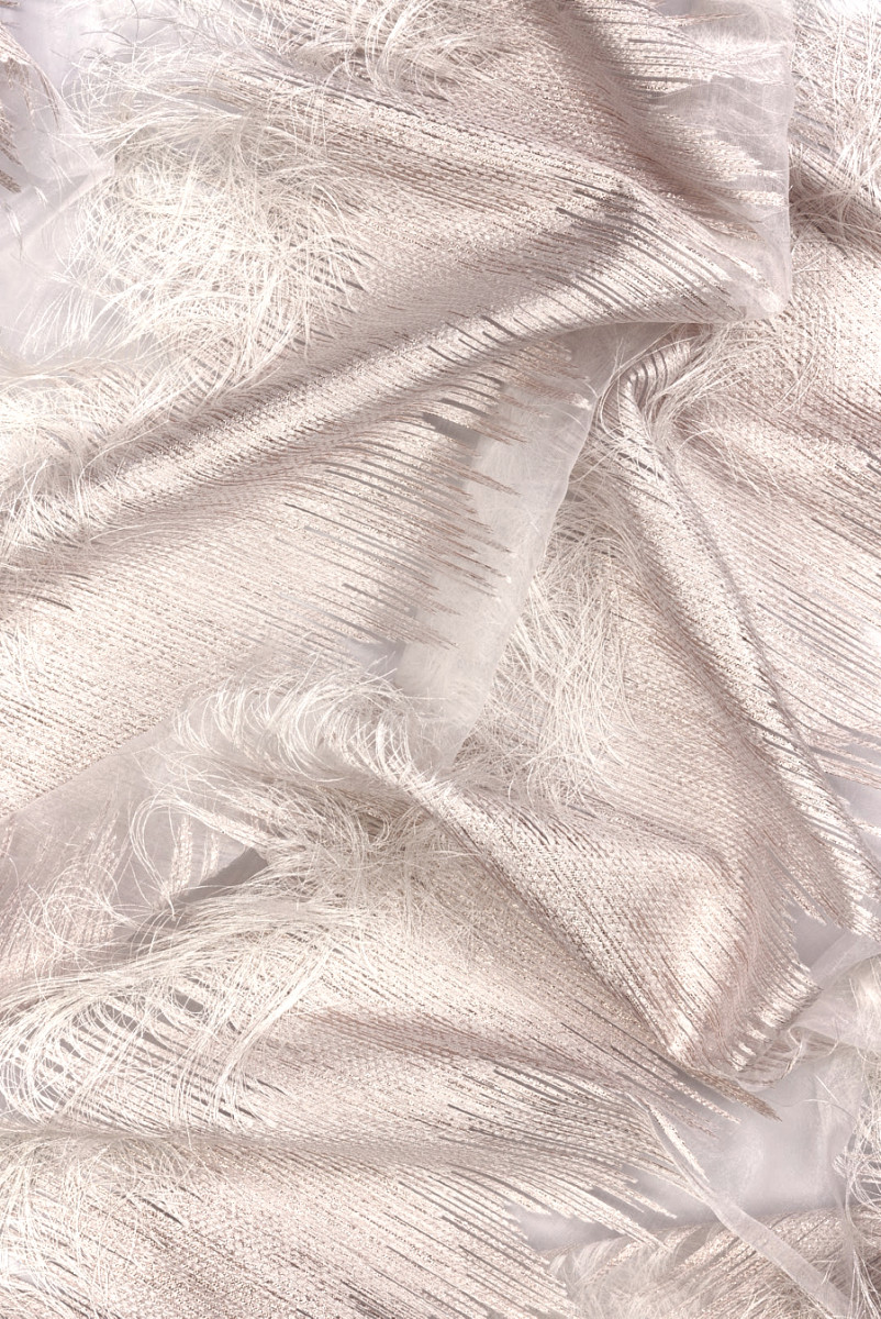 Kreemikas organza polüesterkangas žakaarmotiiviga, millel on kujutatud kreemikas värvi erineva pikkusega tihedalt paigutatud jooni. Korrapäraseid mustreid laiusega 30 cm korratakse 8 cm vahedega kõige laiemas kohas ja need on rikkalikult kaunistatud läikiva roosa kulla niidiga, mis annab kangale huvitava, kergelt roosa värvi. Iga motiiv on viimistletud umbes 9 cm pikkuste tuttidega. Narmade paigutuse tõttu soovitame ümbermõõdulist õmblemist. Kangas on õhuke, kohati läbipaistev ilma kootud mustrita, elastne, istub veidi jäigalt, kuid tänu narmastele omandab mõnusa õhulisuse. Soovitame seda ainulaadset materjali eriti kleitide ja seelikute jaoks.