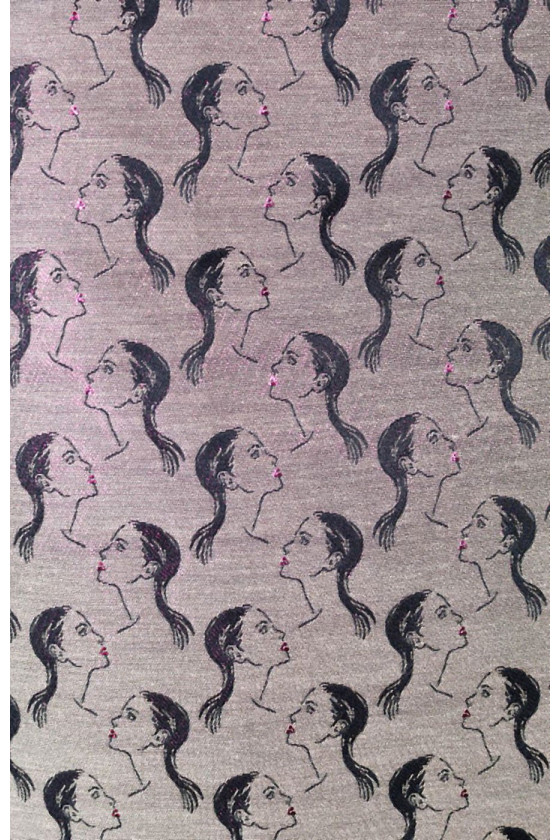 Itaalia jacquardi kostüümikangas. Kangal on väga originaalne taustavärv, sest kude on valmistatud kahest värvi niidist: beež ja läikiv, magenta. Lõim seevastu on must. See kombinatsioon paneb materjali kaunilt sädelema, sõltuvalt valguse langemisnurgast. Muster koosneb roosade, läikivate huultega musta värvi naise arvukatest nägudest. 4 cm suurused näod, vaheldumisi pööratud üks kord paremale ja üks kord vasakule.
