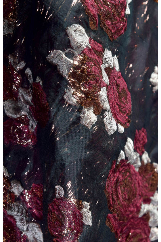 Itaalia jacquardi kostüümikangas. Kangas on valmistatud kahest kihist. Põhi on väga määrdunud roosa ja ülemine on valmistatud õhukesest, läbipaistvast mustast organzast. Nende kahe kanga kattumine annab väga huvitava kahetoonilise efekti ja muudab selle veidi kumeraks, kuid väga kergeks. Tervikut kaunistab rikkalik lillemuster, mis koosneb suurematest kimpudest ja väiksematest üksikutest lilledest. Lillemotiiv on valmistatud Burgundias roosade lehtedega, millel on läikiv vaskniit. See on väga originaalne kangas, millest saate teha ilusa kleidi või südamliku seeliku.