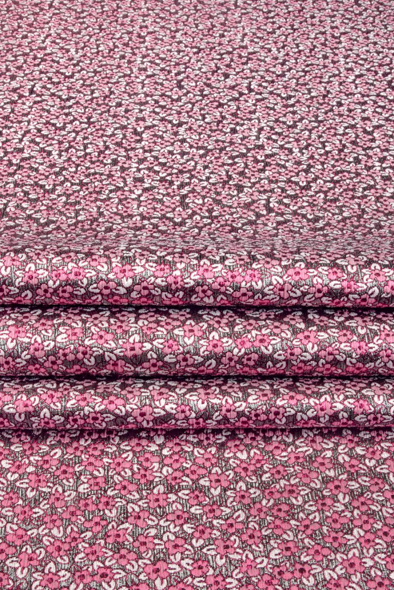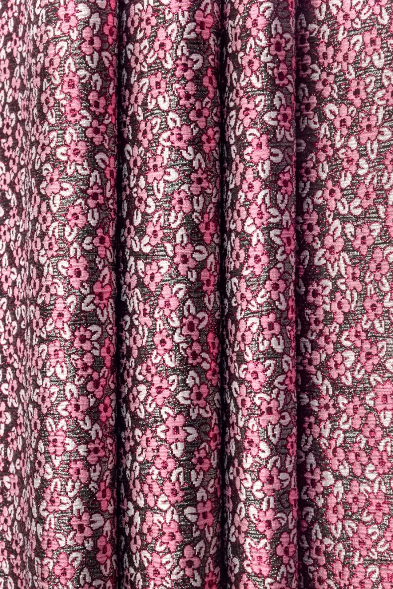 Jacquard väikeste roosade lilledega, millel on valged lehed mustal taustal, millele on lisatud hõbedane ja roosa lurex niit. Kangas on tempermalmist, ideaalne kleitide, seelikute, mantlite, jakkide õmblemiseks.