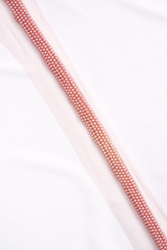 Olasz rövidáru szalag lazac színű, 2,9 cm széles, gyöngyökkel gazdagon díszített. Az egészet egy tüll hálóra varrják a gyöngyök színében. Gyönyörű ajánlat elegáns ruha, blúz vagy szoknya díszítésére.