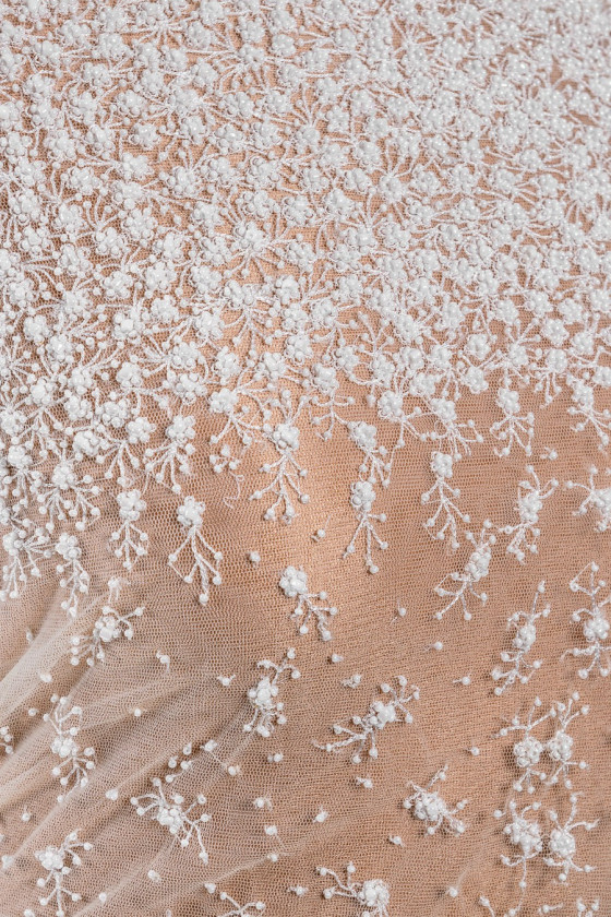 Olasz esküvői rátét fűző formájában (csak elülső) krémszínű. Fényes gyöngyökből készült kis virágok motívuma. A minta középen ritka, és a szélek felé sűrűsödik.