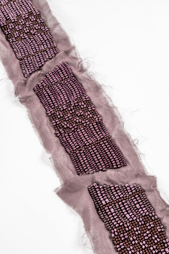 Gyönyörű olasz rátét, selyem georgette-re varrott gyöngyökkel. Hosszúság 18 cm, szélesség 6 cm.