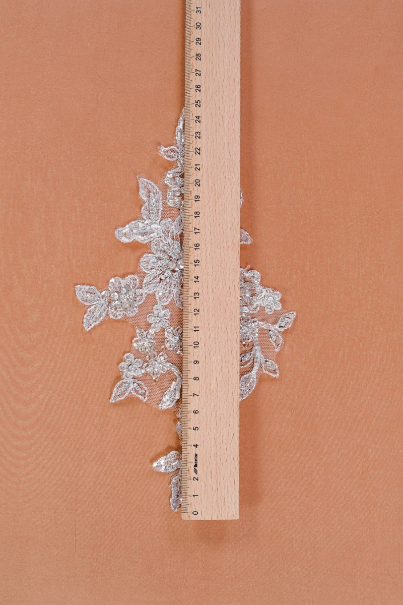 Gyönyörű alkalmazás esküvői vagy estélyi ruhák varrására. Gazdagon díszített gyöngyökkel és flitterekkel.