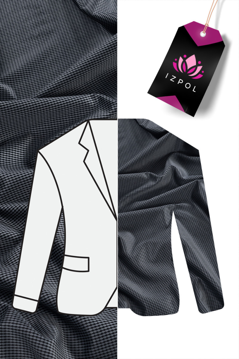 Olasz bársonyszövet fekete és szürke, kis minták motívumával. A szövet kissé merev, rugalmatlan, finom fényű.