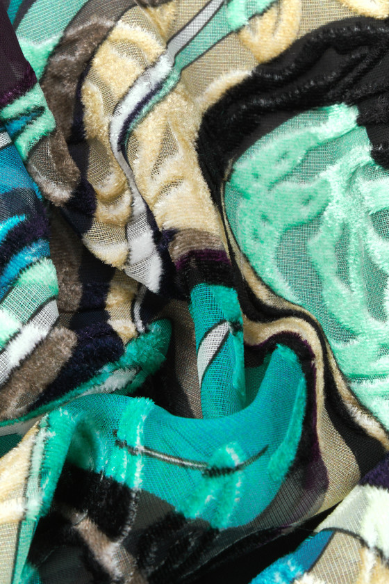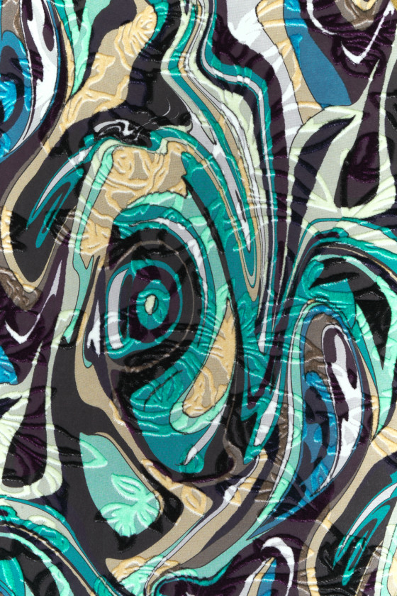 Olasz selyem-viszkóz velúr devore típus, fekete, bézs és türkiz díszes mintákkal. A devory szövet sima, átlátszó selyem sifon, átlátszatlan, velúr viszkóz minták kombinációja.