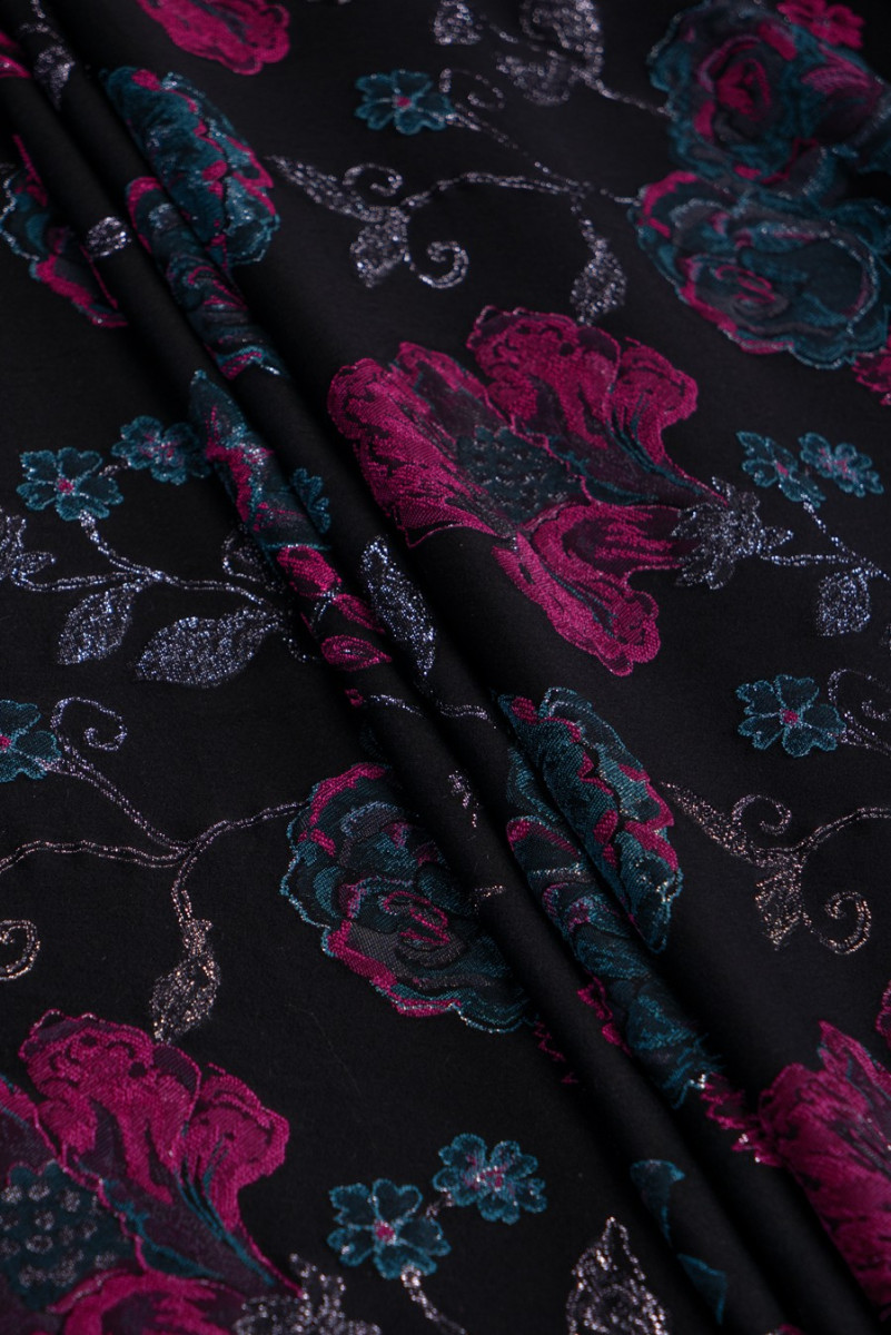 Olasz viszkóz-selyem velúr devore nagy, rózsaszín és piros virágokkal, világos rózsaszín alapon - a minta kerületi. A devory szövet sima, átlátszó selyem sifon, átlátszatlan, velúr viszkóz minták kombinációja.