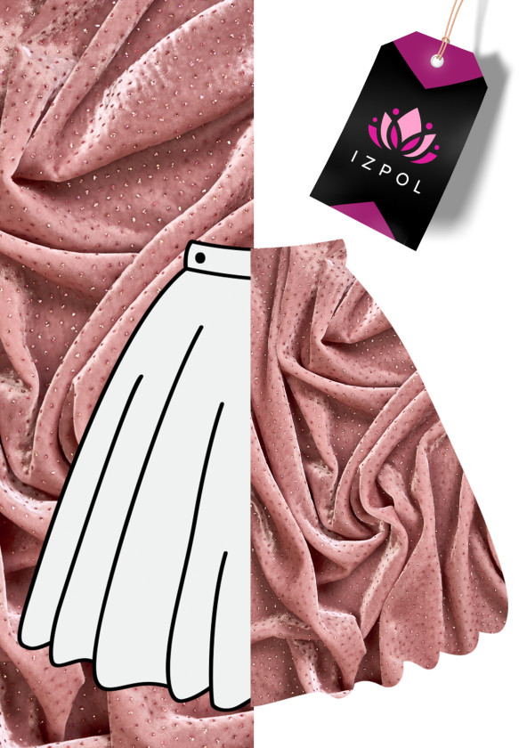 Olasz, exkluzív velúr púderrózsaszínben, színes csillogással díszítve. A szövet puha, áramló, nem rugalmas, vékony, de átlátszatlan. Gyönyörűen drapériázik, és a csillogó dekoráció egyedi megjelenést kölcsönöz az anyagnak. Csodálatos javaslat formális ruha, szoknya vagy blúz létrehozására. A csillogó pontok kissé leesnek, javasoljuk az előzetes zsugorodást.