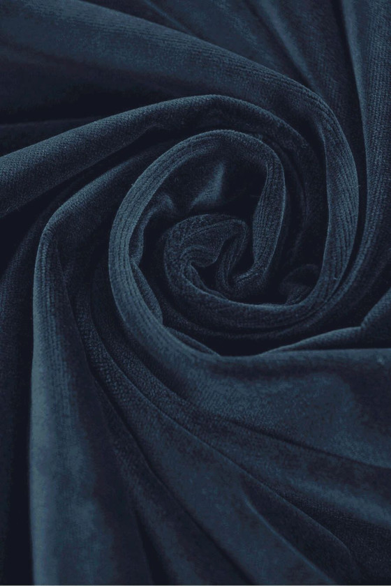 Olasz bársony szövet világos sötétkék színben. 100% -ban természetes pamutból szőtt anyag, jellegzetes rövid hajjal. Ideális javaslat jelmez vagy kabát varrásához, mert a bársony húsos, rugalmatlan, kompakt szövésű. Széles körben használható a belsőépítészetben is, pl. függönyök vagy párnák varrására.