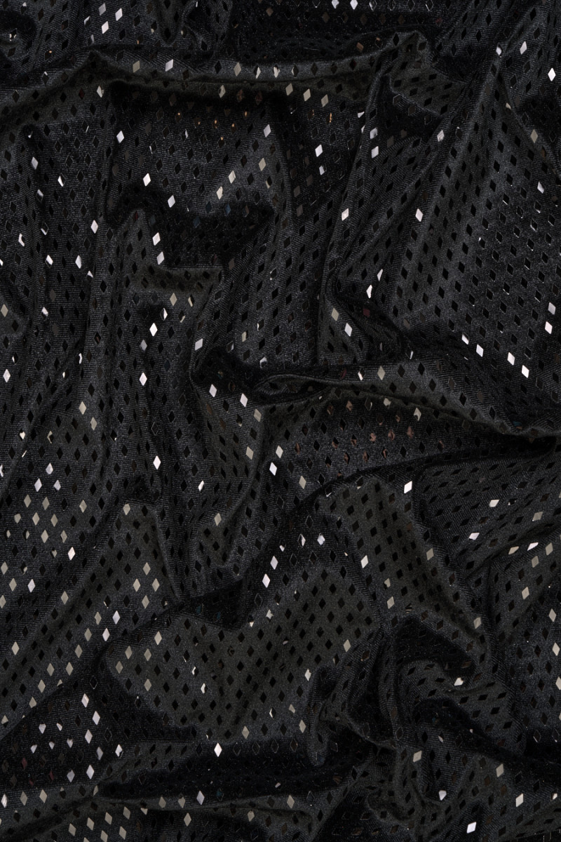 Rugalmas velúr fekete színben, kis, fekete és fényes gyémántokkal díszítve. A számok 4mm * 6mm méretűek. A szövet puha, nagyon rugalmas és átlátszatlan. Ideális esti és parti ruhák, például ruhák, szoknyák, nadrágok vagy jelmezek varrására.