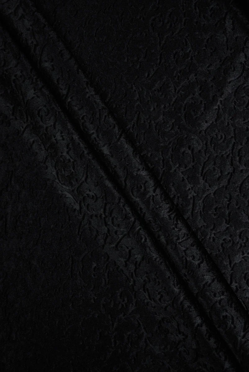 100% pamut bársony, fekete színben, dombornyomnyomott díszmotívummal. Az anyag közepes vastagságú, enyhén rugalmas, átlátszatlan és gyönyörű fényű. Lágyan fekszik, és szépen tartja az alakját. Remek ajánlat azoknak, akik természetes anyagokat keresnek egyedi, elegáns megjelenésben. Tökéletes dzseki, jelmez, szoknya és nadrág varrásához.