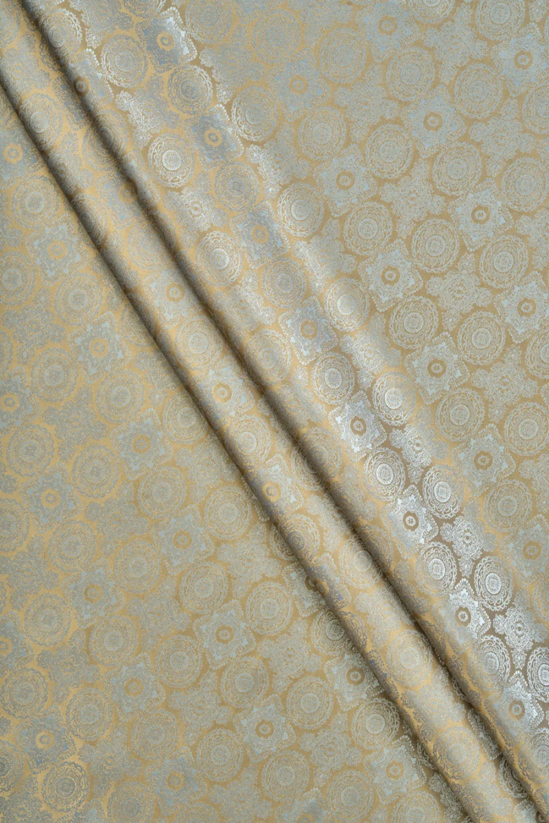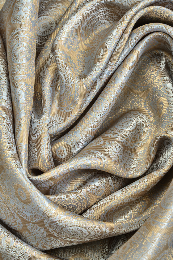 Olasz jacquard kéttónusú bélés arany-szürke. A keleti díszek legdivatosabb mintája. A szövet nem rugalmas, enyhén fényes. Tökéletes kabátok, dzsekik, mellények, dzsekik bélésére.
