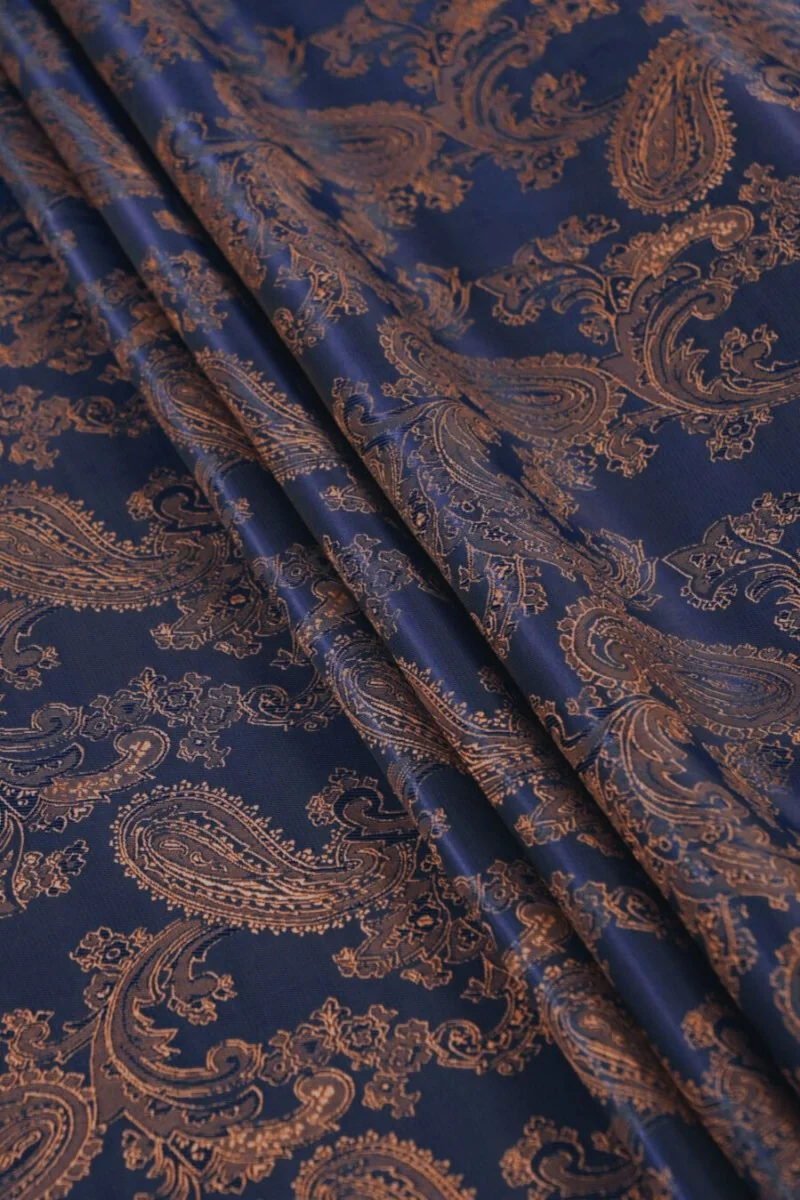 Olasz jacquard bélés keleti motívummal - kéttónusú barna és sötétkék. Nem rugalmas anyag, enyhén fényes. Ideális kabátok, kabátok, mellények, kabátok béléséhez.