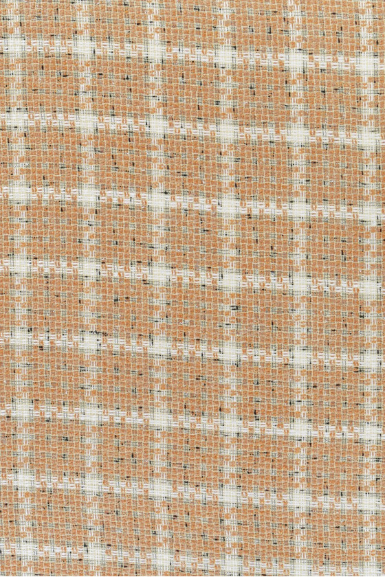 Chanel szövet réz, bézs és fehér színben, finom fekete szálral. A minta 10 x 10 cm méretű ellenőrzést képez. A szövetet akrilszálakból készült laza pamutláncra szőtték. Ruhák, dzsekik, kardigánok varrására ajánljuk. A szövet bélést igényel.
