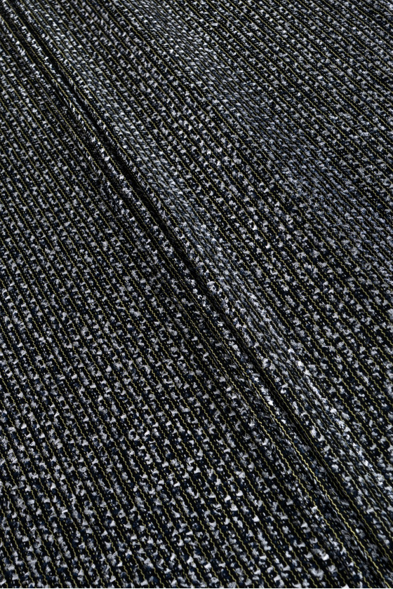 Olasz chanel jelmezszövet fekete színben, fehér és sötétkék, kis bojtok és mészszál, vízszintes csíkokban elrendezve. A Chanel szövet egy nagyon elegáns, puha és húsos anyag, amely eredeti szövéséről ismert.