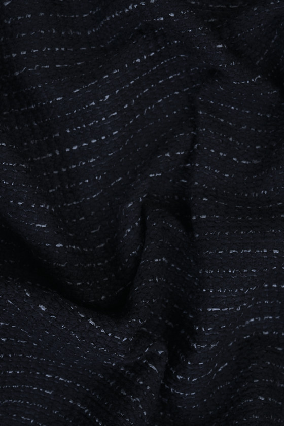 Olasz őszi-téli jelmezszövet fekete szövésű, természetes gyapjúból, viszkóz és akril keverékével. A szövet szürke, vízszintes varrással rendelkezik, amely finom, 1,5 cm széles csíkokat hoz létre. A természetes szálak és a szintetikus szálak kombinációja azt eredményezi, hogy a szövet meleg, ugyanakkor erős és tartós. Tökéletes ajánlat őszi jelmez, kabát vagy ruha varrásához.
