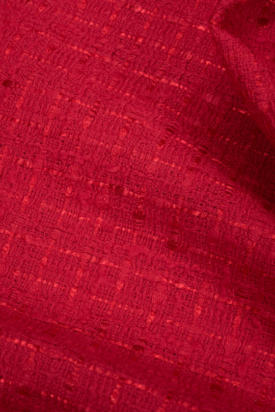Olasz chanel jelmezszövet pirosban. A Chanel szövet egy nagyon elegáns, puha és húsos anyag, amely eredeti szövéséről ismert.