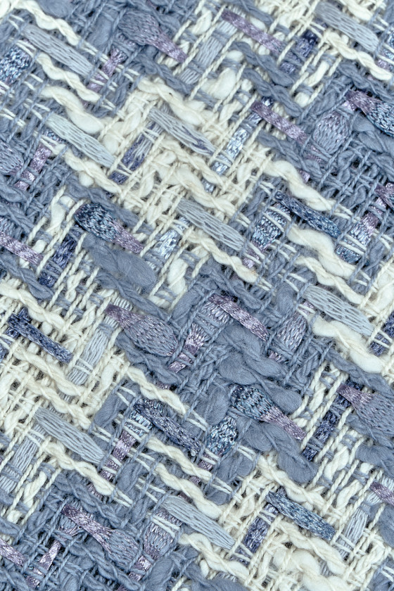 Olasz chanel jelmezszövet világoskék és ecru színben, csillogó kék szállal díszítve. Az anyag puha, kellemes tapintású, főleg természetes szálakból készült, ezért nagyon kényelmes viselet, eredeti szövéséről ismert. Tökéletes jelmez, ruha és vékony kabát varrására.