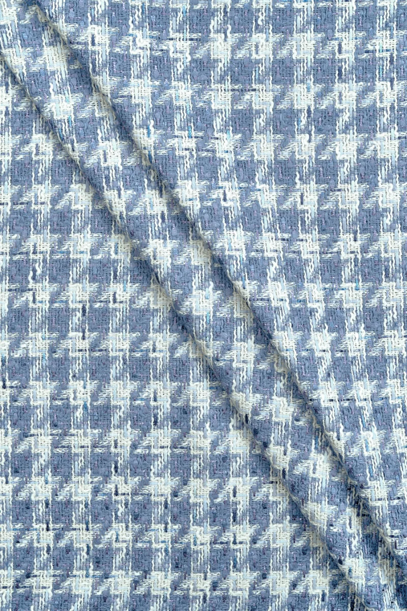 Olasz chanel jelmezszövet természetes szálakból, világoskék és ecru színben, csillogó kék szállal díszítve.