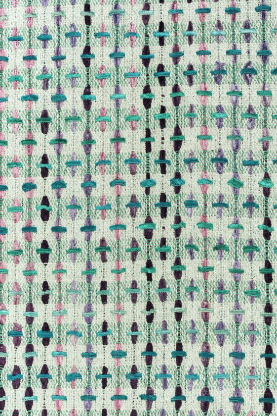 Olasz chanel jelmezszövet sűrű szövéssel, ekrü és menta cérnából. Keresztekre emlékeztető apró mintákkal díszítik, amelyek szőtt szatén szalagokból készülnek a következő színekben: menta, türkiz, rózsaszín és lila. A minták függőleges csíkokat hoznak létre, amelyek gyönyörűen meghosszabbítják és karcsúsítják az alakot. Finoman ezüst, fényes szálat szőttek az anyagba, ami eleganciát kölcsönöz neki. Az anyag nem rugalmas, közepesen vastag és kellemesen puha. A természetes szálak, például a viszkóz és a pamut magas tartalmának köszönhetően az anyag kellemes a fogáshoz, ami viselési kényelmet is jelent. Nagyszerű ajánlat azoknak, akik érdekes szöveteket keresnek. Használható jelmezek, kabátok, szoknyák vagy ruhák varrására.
