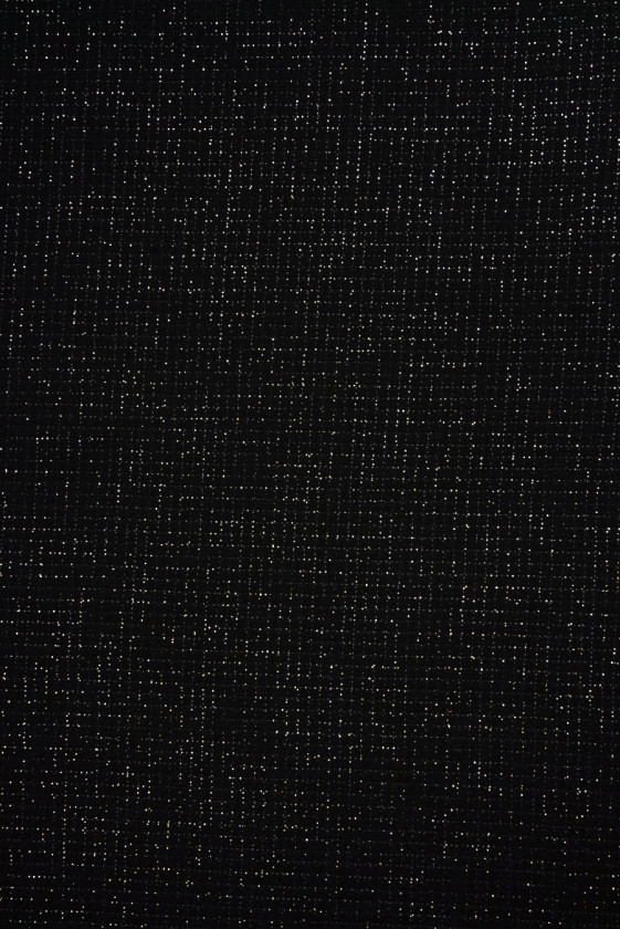 Olasz chanel szövet fekete színben, kis ezüst flitterekkel díszítve. A flitterek és a fényes fekete szál egy kis, szabályos csekk mintáját hozzák létre, ahol egy csekk 1,5 cm * 1,5 cm. Az egészet matt fekete szálból készült kosárfonásból készítik, szalag formájában. Az anyag puha, könnyű, nem rugalmas, vékony, de átlátszatlan, nagyon jól fog működni a tavaszi ruhákhoz. Használható jelmezek, ruhák, szoknyák vagy kabátok készítésére.