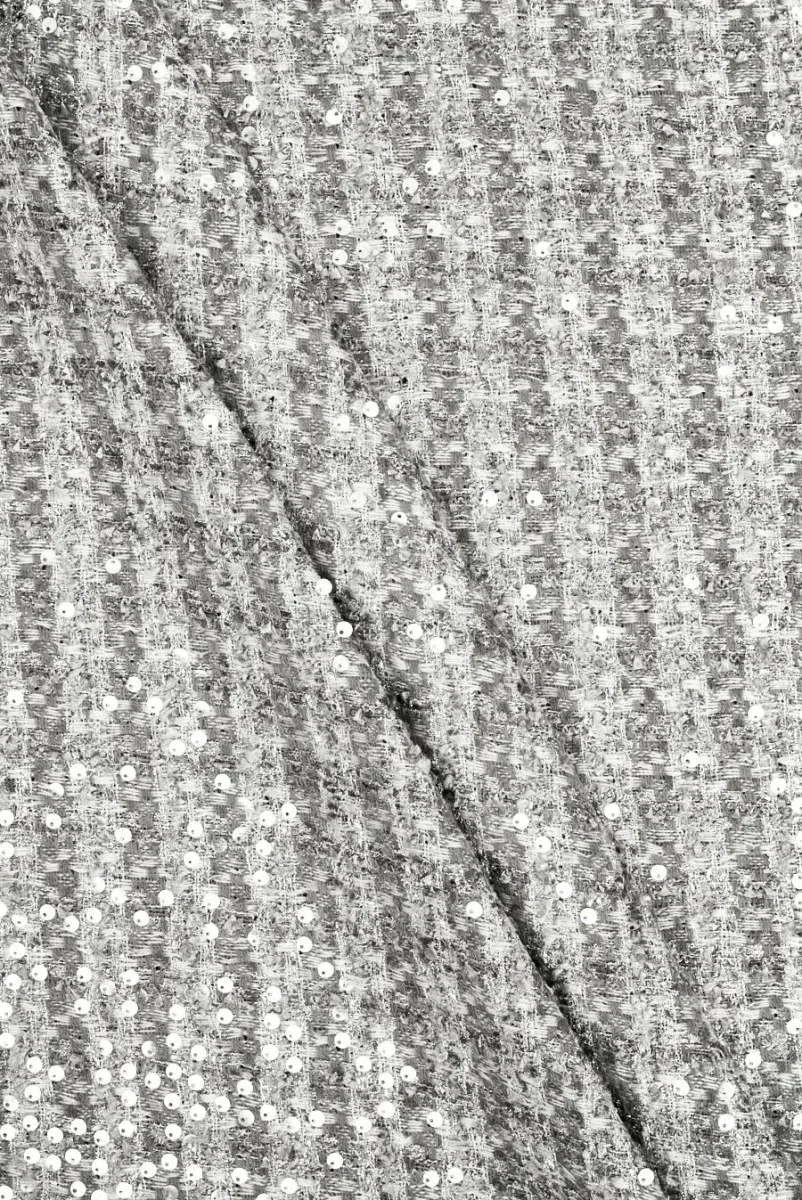 Olasz chanel jelmezszövet ezüstből, kis kockás mintával szőtt. Az egészet gazdagon díszítik átlátszó flitterek, amelyek gyönyörűen visszaverik a fényt, és egy fényes ezüst cérna. Anyaga puha, rugalmatlan, meglehetősen vékony, laza szövésű, erre a fajra jellemző, és érzékelhető szálszerkezetű, kissé kilógó szálakkal. Nagyon elegáns anyag, amelyből ruhákat, szoknyákat, kabátokat és jelmezeket varrhat.
