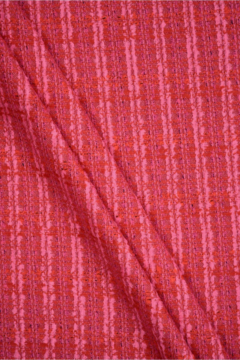 Olasz chanel anyag, amelyet gyapjú, pamut és poliamid keverékéből szőtek, intenzív rózsaszín színben. Az anyag különböző árnyalatú rózsaszín szálakból, valamint piros-fekete színekből készül, amelyeket alkalmanként használnak. Az egész nagyon élénk és energikus. Az anyag puhán fekszik, közepes vastagságú, rugalmas és enyhén laza szövéssel készült, ami erre a fajra jellemző. Tökéletes lesz dzseki, szoknya és ruha varrásához.