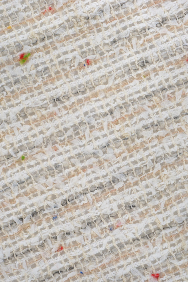 Ruhaszövet, laza szövéssel, mint egy háló, amelyet tavaszi ruhákhoz szántak krémszínekben, nagyon világos bézs, finom, színes akcentussal.