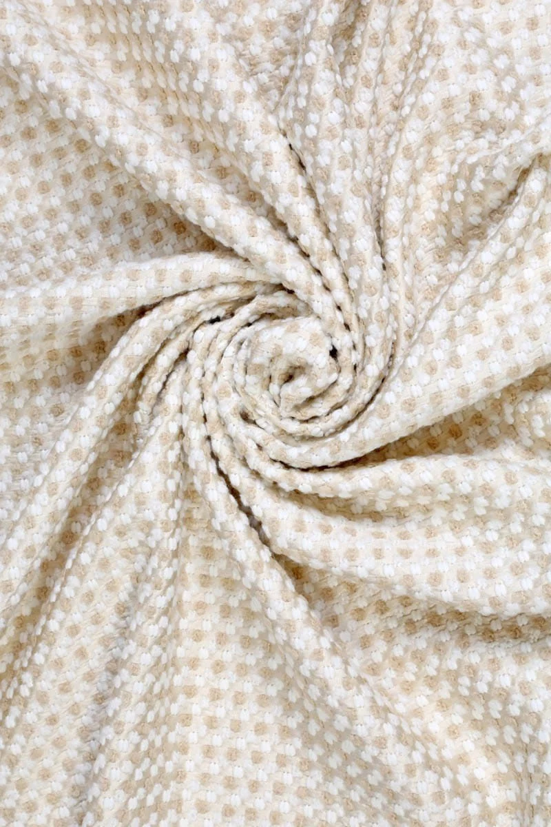 Olasz chanel jelmezszövet. Nagyon érdekes kombinációja egy csillogó aranyszövetnek és egy finom grosgrain szövésnek, bézs és écru átlapokkal, amelyek egy kis kockát alkotnak. A szövet konvex szövésű, kissé merev és kissé fényes. Fantasztikus ajánlat azok számára, akik szeretik az eredeti szöveteket időtlen színekben.